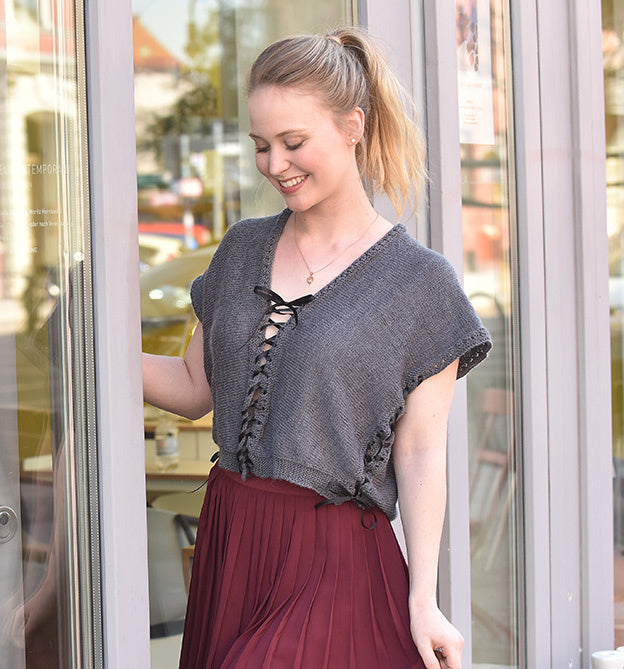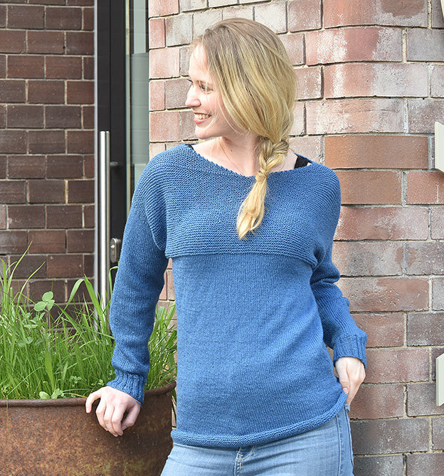 Je nachdem, welches Garn du verwendest oder welche Garne du kombinierst, erhältst du ein völlig neues Design. Für alle, die mehr brauchen als nur glatt rechte Maschen, gilt der Grundsatz – fühlt euch frei und habt Spaß dabei. Öffnet euer Musterbuch, welches ihr daheim habt und baut euch Musterstreifen ein, egal ob Quersteifen oder Längsstreifen, ob mit Löchern, Zöpfen oder Strukturmustern, hier könnt ihr euch austoben und euer ganz individuelles Designerteil zusammenbauen." (Sylvie Rasch)